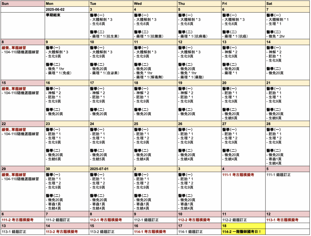 學期結束後的「全力衝刺期」,我把時間分成「讀書」和「刷題」兩部份,分別用了 31 天和 14 天。會把這兩個拆開是因為我喜歡先把書讀完,再把考古題當正式考試來訓練手感,如果你跟我一樣的話,可以參考下面的行程表~